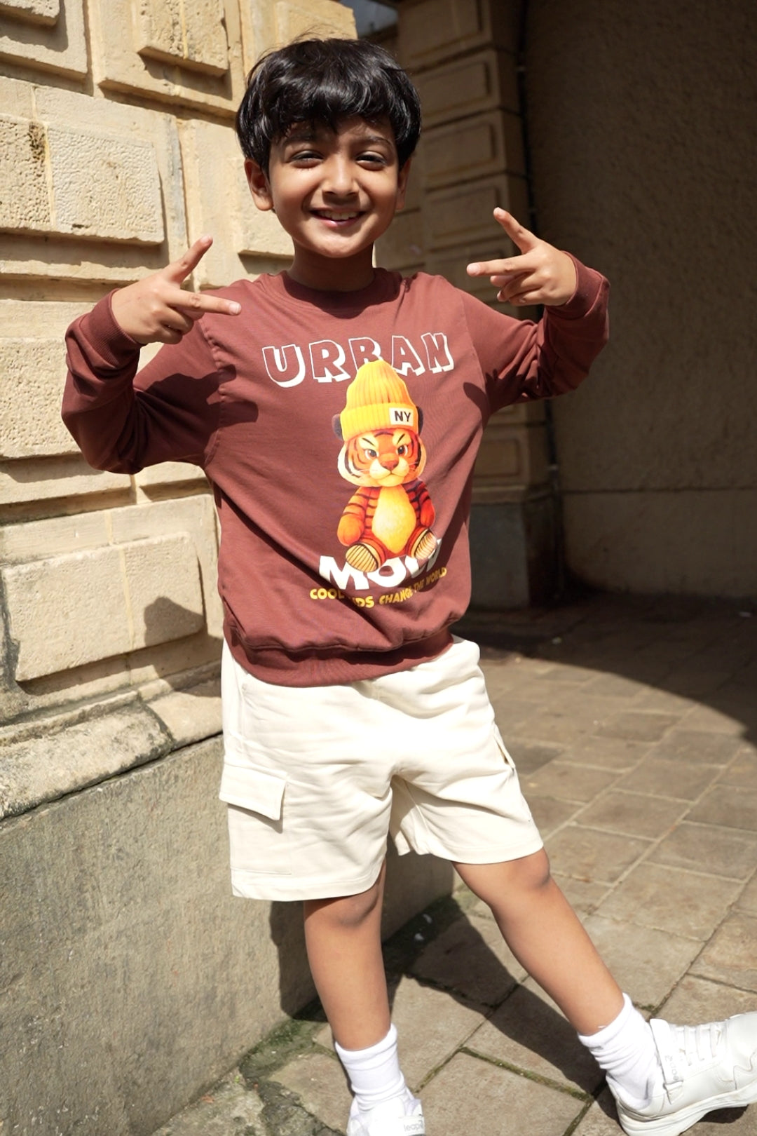 Streetwear meets playground cool in this versatile co-ord. This is an outfit that works as hard as it looks. The sweatshirt brings a clean, urban edge, while the cargo pocket shorts add utility with a side of style. Crafted in 100% cotton, it’s soft yet sturdy and is ideal for days that flip between play, chill, and everything in between.