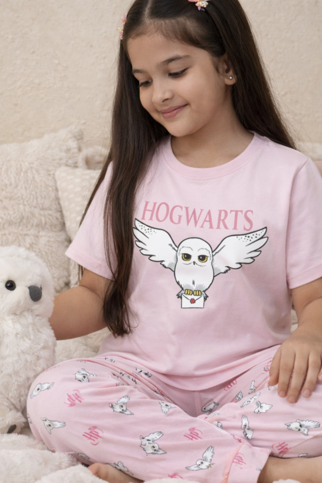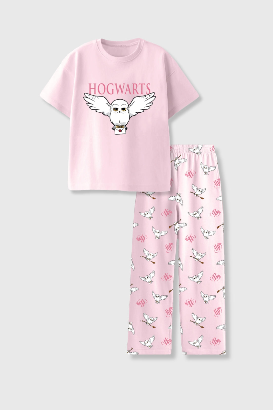 Evenings sometimes soften on their own, and this set seems to follow that rhythm. The light pink tee and pajama pants feel gentle against the skin while the house grows quieter, and thoughts wander at their own pace. With Hedwig around, even bedtime feels calm and quietly magical.