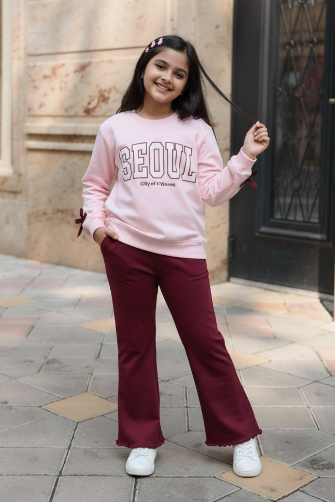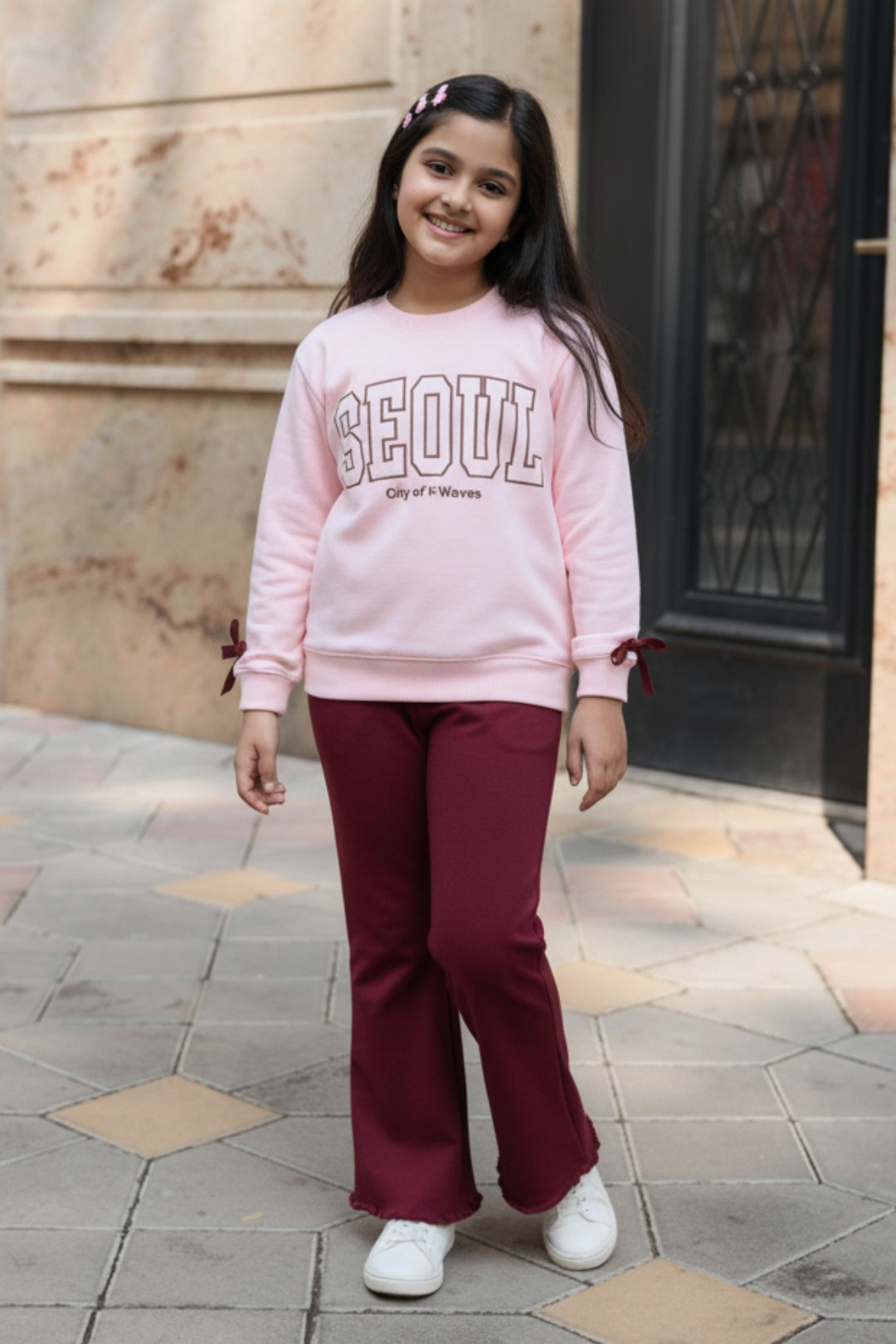 Bring K-style vibes to everyday adventures with the Seoul Dreams Co-Ord Set. Featuring a pink sweatshirt and ripped bell-bottoms, this set is full of playful personality and trendy flair. Crafted in soft French terry, it’s perfect for making every outing, playdate, or casual hangout feel like a mini runway moment.